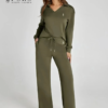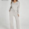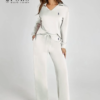 The sweatshirt ensembles are designed with a sporty polo collar, V-neck and asymmetric hem; the high-waisted drawstring pants are made with a loose fit that reveals wide legs; The asymmetric hem offers more coverage on the back and is 4-way stretch for ease of movement.